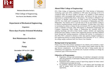 3 Days Practice Oriented Workshop on Best Maintenance Practices for Pump from 19th to 21st December, 2018.